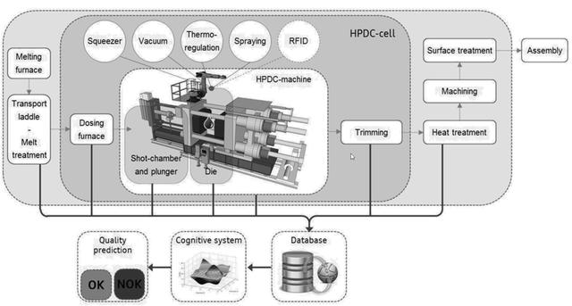 ![]() 圖1、典型冷室壓鑄過程 壓鑄,又稱為高壓鑄造,是一種近些年來被廣泛應(yīng)用于汽車、航空航天和電子工業(yè)中的近凈成形技術(shù)。在壓鑄過程中,熔融金屬(一般為輕合金)在沖頭的作用下以高壓、高速充填型腔,并快速冷卻,形成最終的鑄件。 壓鑄一般分為冷室壓鑄和熱室壓鑄,冷室壓鑄主要應(yīng)用于大型零部件的產(chǎn)生,比如汽車零部件、通訊基站冷卻部件等;而熱室壓鑄則廣泛應(yīng)用于小型電子或3C產(chǎn)品的生產(chǎn)過程,比如USB接頭、筆記本殼體等。 壓鑄具有很好的自動(dòng)化基礎(chǔ) 與普通鑄造過程相比,壓鑄的特點(diǎn)是高速、高壓,所生產(chǎn)的產(chǎn)品一般為輕合金薄壁件,但壓鑄技術(shù)也被應(yīng)用于純銅轉(zhuǎn)子的生產(chǎn),與鋁、鎂合金不同,純銅的熔點(diǎn)很高,因此純銅壓鑄過程中模具壽命短是一個(gè)很大的問題。 在所有鑄造技術(shù)中,壓鑄的自動(dòng)化程度最高。現(xiàn)代的壓鑄企業(yè)采用自動(dòng)化壓鑄島技術(shù),該技術(shù)將壓鑄機(jī)(一般為幾十甚至上百臺(tái))高度集成,形成了完全自動(dòng)化的生產(chǎn)過程。同時(shí),采用智能工廠技術(shù),將壓鑄機(jī)的生產(chǎn)過程進(jìn)行監(jiān)控,對(duì)每一臺(tái)的壓鑄機(jī)的性能和狀態(tài)進(jìn)行實(shí)時(shí)把握,通過大數(shù)據(jù)測量和實(shí)時(shí)反饋,及時(shí)對(duì)壓鑄機(jī)生產(chǎn)過程進(jìn)行調(diào)整,以保證產(chǎn)品最終質(zhì)量。