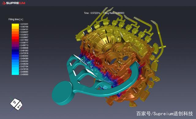 圖4、鑄造生產(chǎn)線部署的高速CT系統(tǒng) 工藝反饋及調(diào)整 在鑄件被CT檢測并獲得三維實(shí)體數(shù)據(jù)的前提下,我們假設(shè)有這樣一種算法:能夠以非常高效的方式將該數(shù)據(jù)進(jìn)行整體分析,并給出鑄件內(nèi)部缺陷的所有信息,包括類型、尺寸和分布等,那么我們就能利用這個(gè)信息對(duì)生產(chǎn)工藝本身進(jìn)行調(diào)整和修正,并最終獲得無超標(biāo)缺陷的合格鑄件。這個(gè)過程——即獲得鑄件信息并修正工藝的過程,我們稱之為工藝反饋和調(diào)整過程。當(dāng)然,我們不能只根據(jù)一個(gè)鑄件的信息來完成這個(gè)過程,最正常的情況應(yīng)該是獲得大量鑄件的信息,通過統(tǒng)計(jì)分析和工藝關(guān)聯(lián)的方法解決鑄件的缺陷問題。 接下來的問題是,即使我們獲得了大量鑄件內(nèi)部的缺陷分布信息,我們又如何通過調(diào)整工藝參數(shù)來規(guī)避不合格缺陷呢?現(xiàn)有的最有力的分析工具是計(jì)算機(jī)數(shù)值模擬,也就我們熟知的計(jì)算機(jī)輔助工程(CAE)技術(shù)。 采用計(jì)算機(jī)模擬技術(shù),我們可以實(shí)現(xiàn)局部意義上的虛擬生產(chǎn),特別地針對(duì)壓鑄,我們可以將充型和凝固過程直接進(jìn)行數(shù)值模擬,通過研究流體充填型腔過程的速度、壓力、流態(tài)、噴濺等行為,來判斷充填過程是否存在卷氣;通過計(jì)算壓鑄不同循環(huán)條件下鑄件和模具的溫度的變化,來判斷和研究模具潛在的熱節(jié)、鑄件缺陷(縮孔、縮松)以及壓鑄熱平衡行為。通過這種數(shù)值模擬技術(shù),在一定的分析條件的基礎(chǔ)上,我們?cè)诤艽蟪潭壬峡梢耘袛嗖⒁?guī)避鑄件內(nèi)部的缺陷,提高鑄件性能并大幅提高生產(chǎn)效率,達(dá)到之前我們討論的工藝反饋和修正的目的。