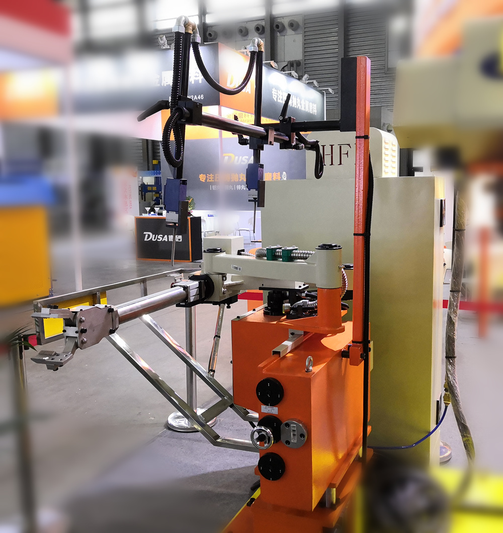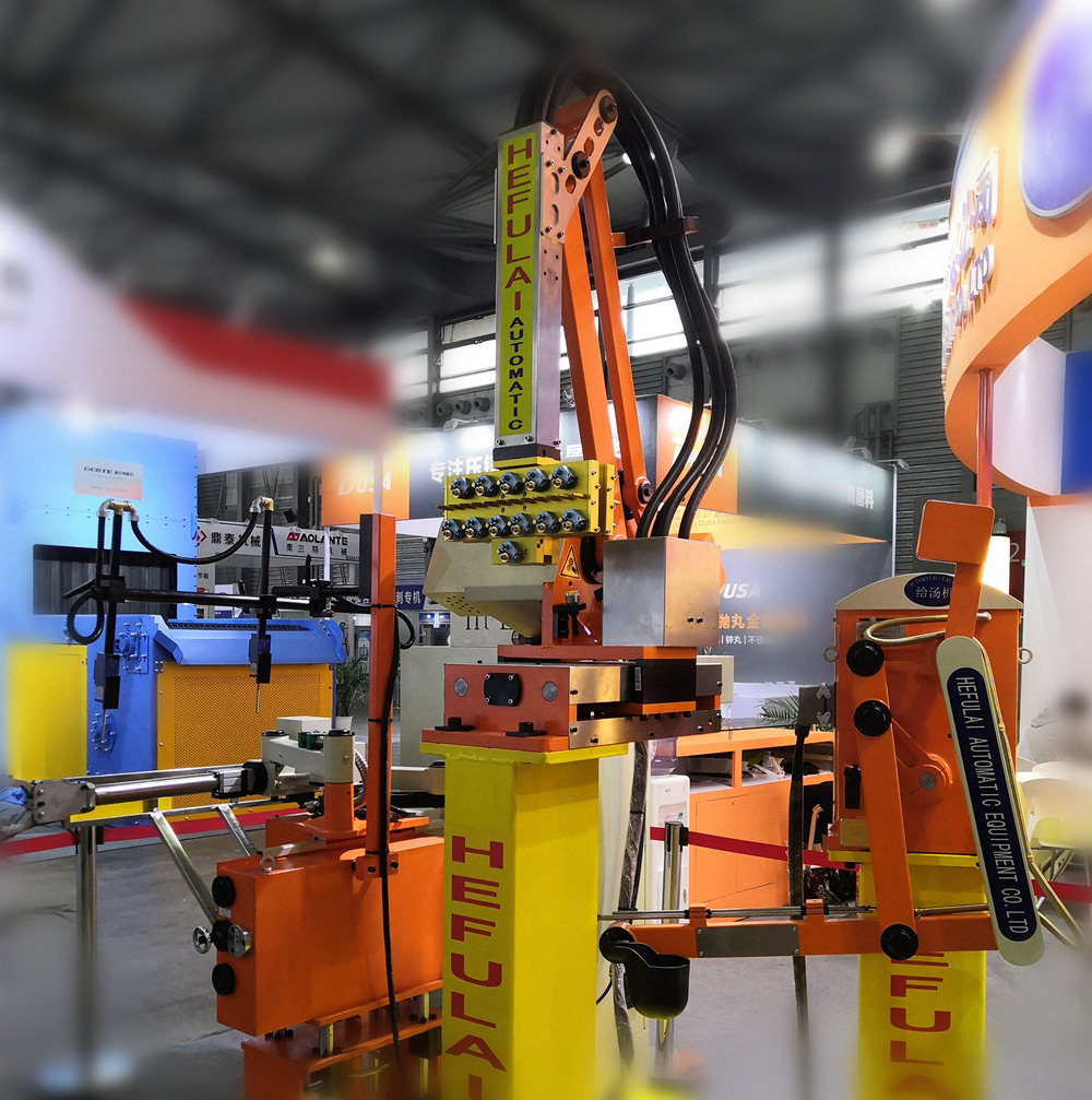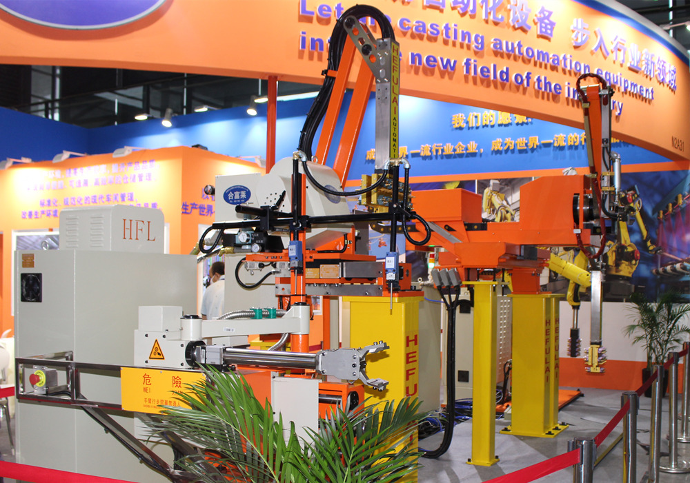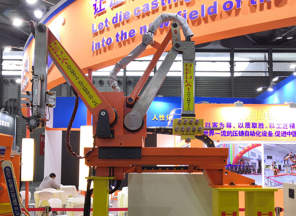 東莞合富萊機器人集成壓鑄島 據(jù)介紹,在機器人集成壓鑄島方面,東莞合富萊已完成從自主知識產(chǎn)權(quán)的控制系統(tǒng),到硬件部分,除機器人本體以外的中央控制柜、夾爪、制品檢出、底座、H320沃鈴模組、閥體控制箱、架臺等的開發(fā)和制造。同時,聯(lián)合用戶的應(yīng)用場景,開發(fā)了許多訂制化的壓鑄島解決方案,掌握了成熟的技術(shù)、工藝及應(yīng)用經(jīng)驗。公司已為汽車零部件、5G基站配件等壓鑄件生廠商,提供數(shù)量眾多的機器人集成壓鑄島生產(chǎn)線。 新型連桿噴取機器人首次亮相華東展會 值得一提的是,東莞合富萊此次展示的HFLREB系列連桿噴取機器人,為首次在國際壓鑄展上展示的產(chǎn)品。這款新產(chǎn)品是在噴取一體線性機器人基礎(chǔ)上進行全面改進的新機型,由于線性機器人導(dǎo)軌長期高溫、腐蝕氣體影響,導(dǎo)致導(dǎo)軌使用壽命短;同時安裝于頭板正上方,取出壓鑄件時,容易受脫模劑霧氣污染,為此該新機型引入傳統(tǒng)壓鑄“三手”的連桿結(jié)構(gòu)的優(yōu)勢,結(jié)合用戶實際生產(chǎn)的實踐并不斷改進優(yōu)化,既保留了原噴取一體線性機器人的優(yōu)點,又成功解決了這一缺陷問題。