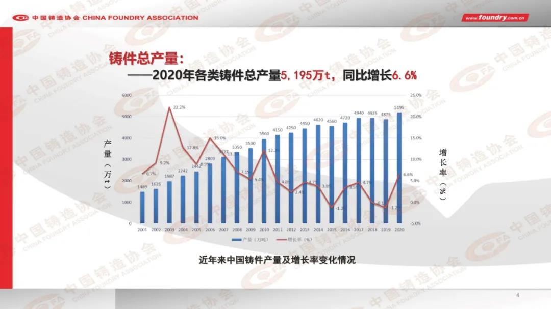 ![]() 來自中國鑄造協(xié)會(huì)消息,2020年年底,我國部分經(jīng)濟(jì)指標(biāo)已經(jīng)恢復(fù)到疫情前的水平,機(jī)械工業(yè)也得到快速恢復(fù)。受下游主機(jī)行業(yè)的帶動(dòng),2020年我國鑄件總產(chǎn)量達(dá)到5195萬噸,同比增長(zhǎng)6.6%。