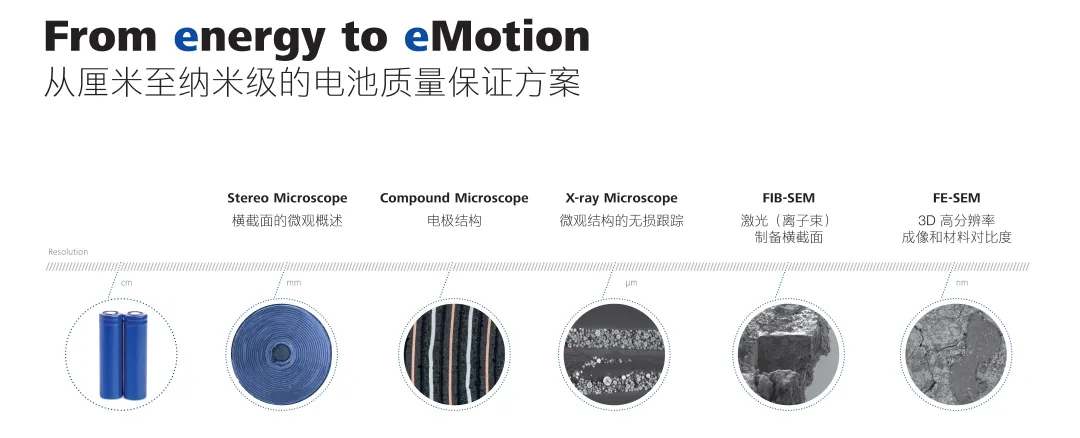 蔡司為電池研發(fā)生產(chǎn)、電控生產(chǎn)制造及電驅(qū)動(dòng)企業(yè)等提供全方位的解決方案。蔡司電動(dòng)汽車解決方案中的光學(xué)顯微鏡、電子顯微鏡、X射線顯微鏡、計(jì)算機(jī)斷層掃描系統(tǒng)(CT)和三坐標(biāo)測量機(jī),可以在多維度不同精度級(jí)別下用于評(píng)估電池的結(jié)構(gòu)、成分、電氣和尺寸特性,并建立這些數(shù)據(jù)之間的關(guān)聯(lián)。這些相關(guān)數(shù)據(jù),能進(jìn)一步幫助車企提高新能源汽車的安全性和性能。例如:以顯微鏡助力前端材料的探索與研發(fā),以X射線無損檢測技術(shù)助力電池生產(chǎn)的質(zhì)量檢測等。