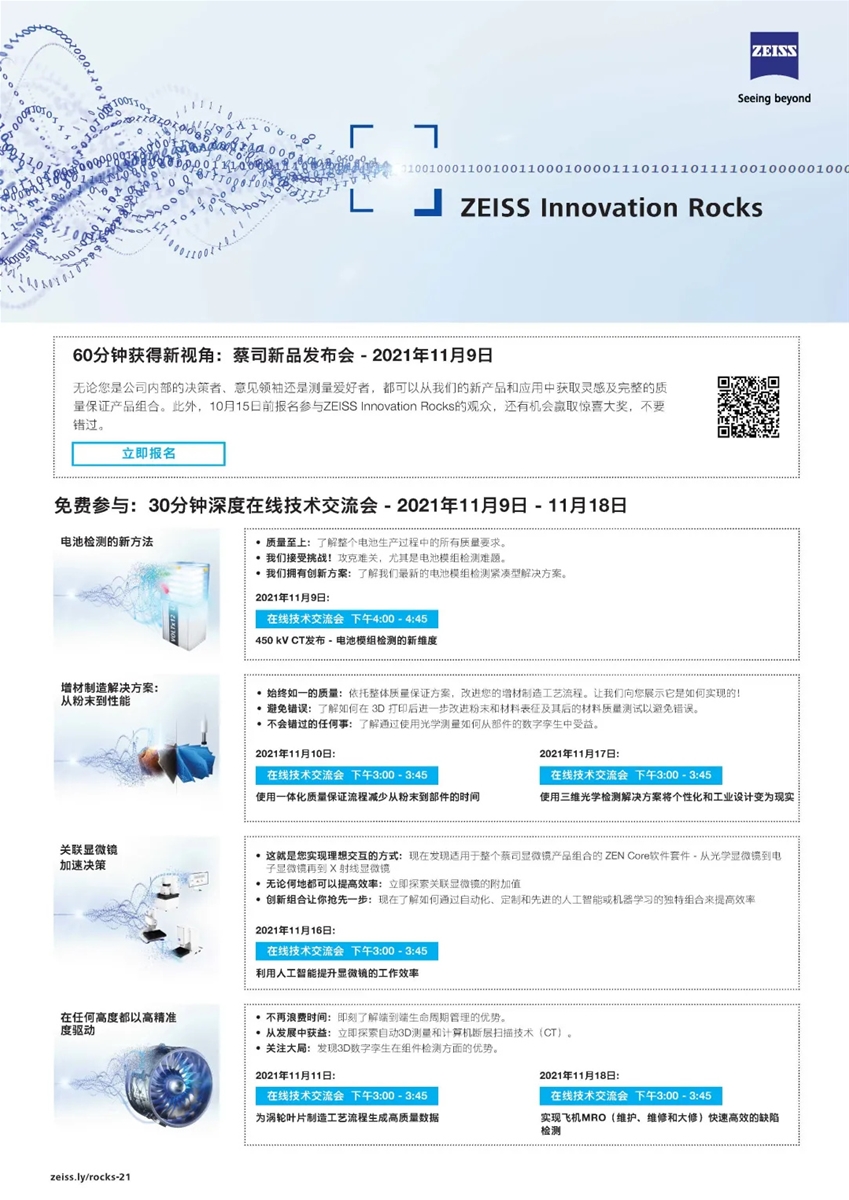 整體而言,蔡司的全方位電動(dòng)汽車解決方案覆蓋了從電池材料的前端研發(fā)到最終模組成品的檢測全流程,質(zhì)量標(biāo)準(zhǔn)涵蓋從選擇材料(包括鋰化合物、陰陽極材料及隔膜)到控制電極制造過程中的關(guān)健步驟。 在11月9日-18日舉辦的,蔡司秋季版線上全球新品發(fā)布會(huì),電動(dòng)汽車解決方案是本次活動(dòng)的“重頭戲”之一。為順應(yīng)當(dāng)下的行業(yè)需求,蔡司電動(dòng)汽車解決方案再次擴(kuò)充,將在9號(hào)當(dāng)天發(fā)布一款針對(duì)新能源汽車電池模組檢測的緊湊型工業(yè)CT。這一即將發(fā)布的新型450 kV 級(jí)工業(yè)CT,將進(jìn)一步提升蔡司電動(dòng)汽車解決方案的整體實(shí)力。 想了解450 kV CT有哪些功能亮點(diǎn),參與11月9日的蔡司新品發(fā)布會(huì),為您揭曉。