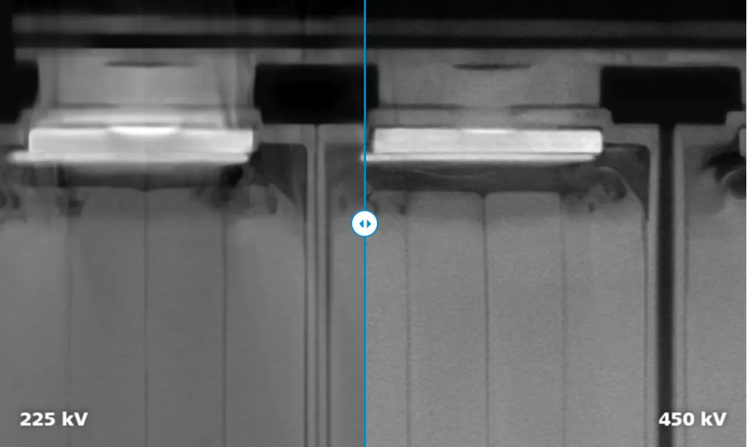 ▲ 使用225 kV和450 kV技術掃描電池模組的對比圖 正如蔡司上海電池技術中心的負責人Albert Mo所說,“我們需要較高的功率和電壓來穿透大型模塊并在合理的節拍內獲得準確結果”,ZEISS VoluMax 9 titan結構緊湊,且具有相當大的穿透力。該系統可釋放1,500W的功率,配備3K探測器,可實現高分辨率掃描,擁有強大的功能,足以掃描整個電池模組。