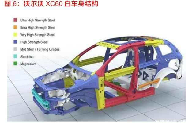 目前底盤輕量化的主要路徑是以鋁合金代替鋼鐵,汽車底盤鋁合金部件包括轉向節、副車架、制 動卡鉗、控制臂、輪轂、各種殼體等。據中國產業信息網數據,2020 年中國汽車市場中鋁合金轉 向節、副車架、制動卡鉗、控制臂的滲透率分別為 15%、8%、40%、5%,具有廣闊的提升空間。 據國際鋁業協會數據,鋁合金在動力系統的滲透率達 90%,汽車底盤與其相比仍是藍海市場。 國內眾多鋁合金精密壓鑄公司均在底盤輕量化領域有所布局,隨著汽車輕量化需求不斷增加,預計鋁合金部件將在底盤領域加速滲透,相關零部件公司有望從底盤輕量化趨勢中持續受益。 2.2 車身輕量化:熱成型鋼及輕量化工藝為主流途徑 汽車車身是整車重量占比最高的部分,也是輕量化潛力最大的領域,傳統汽車中以高強度鋼代替 普通鋼材能減重約 11%,采用鋁合金則能減重約 40%,輕量化材料減重效果顯著。鑒于車身強度 要求、輕量化材料價格及加工技術水平等問題,鋼材作為汽車車身主要材料的地位短時間內難以 撼動。 鋁合金材料在輕量化程度和耐腐蝕性等方面相較于鋼材優勢明顯,然而鋁合金在車身上的應用仍 面臨巨大的挑戰:(1)加工工藝復雜。目前鋼材加工工藝已非常成熟,而鋁合金車身的加工和 連接需要鋁電阻點焊、自沖鉚接、膠接連接、激光焊接等多種工藝,生產流程的復雜度和自動化 要求遠高于傳統鋼材車身。(2)制造成本高。首先是鋁合金本身的價格較高,車用鋁合金單價 約為每噸 1.5 萬,是鋼材料的近 3 倍,其次復雜的加工工藝使得鋁合金車身成本進一步提升。(3)維修成本高,由于鋁材延展性較差且維修工藝復雜,鋁合金車身維修通常需要全件更換,導致售 后維修費用大幅增加。據文燦股份公告,目前鋁合金車身結構件在燃油車的滲透率僅為 3%,在 純電動車的滲透率為 8%,隨著加工工藝改進及電動汽車減重需求持續提升,預計鋁合金等輕量 化材料在車身上的應用將不斷增加。 現階段使用熱成型鋼等超高強度鋼材及輕量化制造工藝是實現車身輕量化的主流途徑。熱成型鋼 是將鋼板加熱至 880-950℃后,在冷卻模具中進行熱沖壓成型及淬火處理,得到超高強度的沖壓 件。熱成型鋼材具有極高的材料強度,具有 1000 MPa 以上的屈服強度和 1300MPa 以上的抗拉 強度,是普通鋼材的 2 倍以上。目前主流的白車身由普鋼、高強度鋼、熱成型鋼等不同強度鋼材 復合連接而成,其中熱成型鋼通常應用于車身前后保險杠、AB 柱、中通道等重要安全結構件,能 夠以更低的厚度實現相同的安全性能,從而實現車身輕量化。除熱成型技術外,激光拼焊、液壓 成型等輕量化制造工藝也能夠在保證車身安全性的前提下減少鋼板厚度,達到車身輕量化目的。