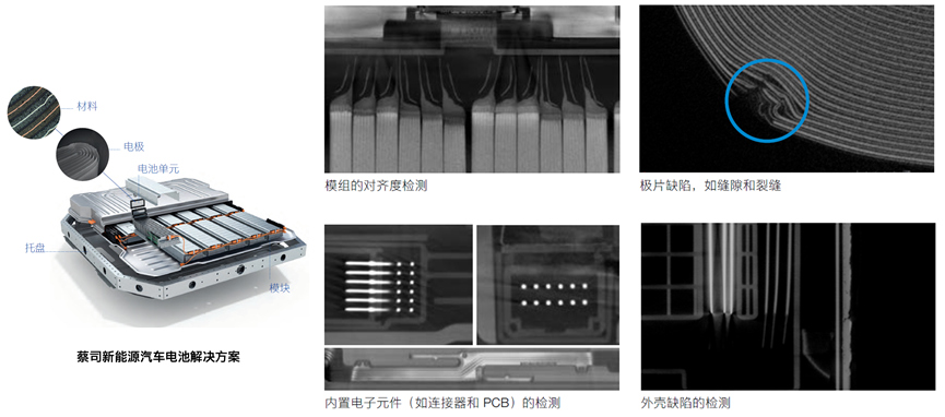 蔡司工業(yè)CT和顯微鏡確保電池研發(fā)和生產(chǎn)中的質量 例如在材料研發(fā)環(huán)節(jié),電芯材料的微觀結構將決定電池的性能,蔡司顯微鏡可用于分析表征材料微觀結構、化學成分到電氣特性,這些解決方案相互關聯(lián),從而能分析出局部屬性對整體性能的影響。 在電芯生產(chǎn)環(huán)節(jié),CT檢測助力電池廠商找到電池發(fā)熱、失效及短路等根本原因,從源頭避免缺陷電芯流入市場。 在模組裝配環(huán)節(jié),蔡司微焦點 X 射線管能以高分辨率和高效率對電池及其模組進行更好的CT成像,X射線光學技術和機電一體化技術的結合保證了電池及其模組檢測的精確性、設備的穩(wěn)定性和操作的可靠性。