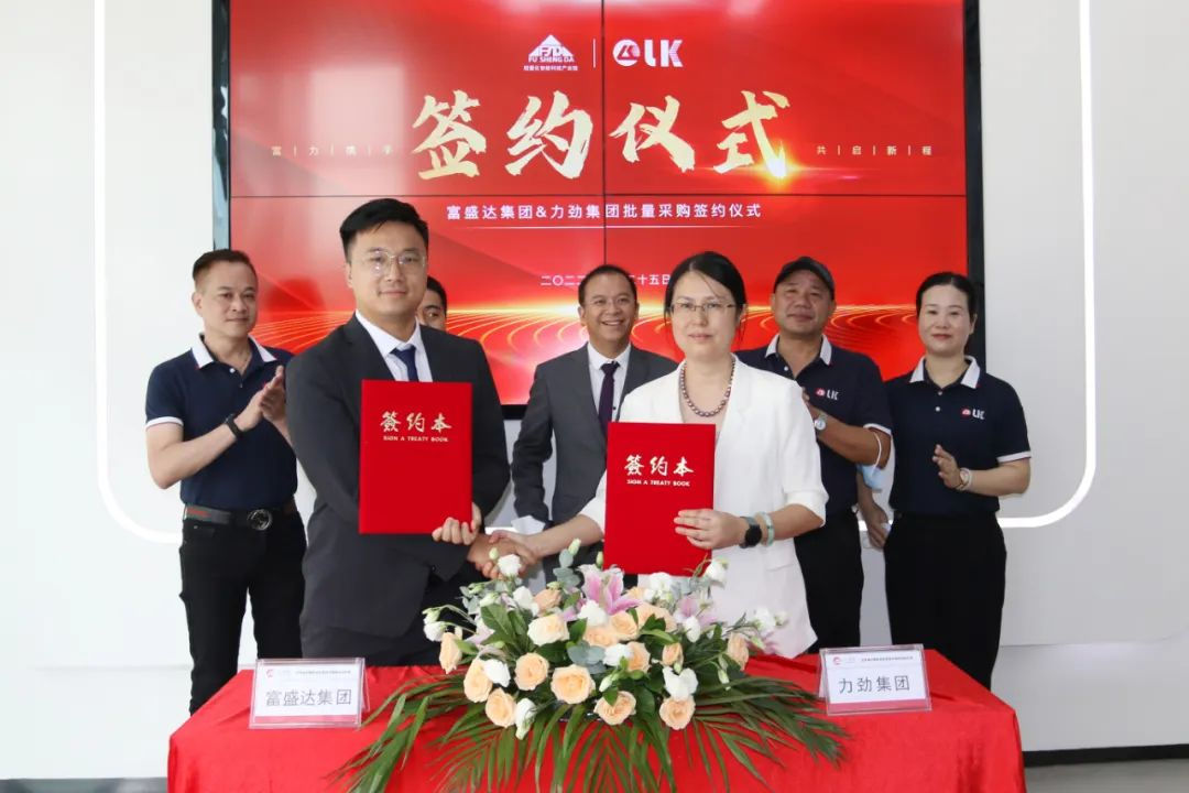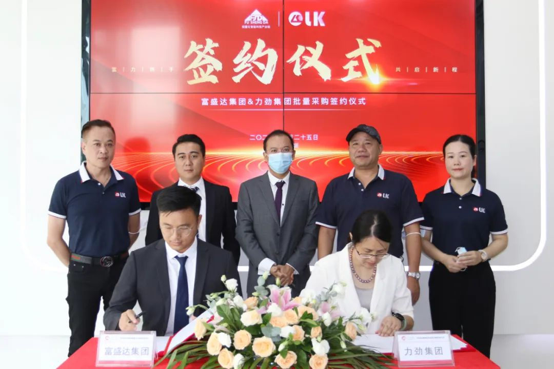 富盛達集團總經理肖威、力勁集團深圳領威科技有限公司總經理潘玲玲女士共同簽署力勁壓鑄單元批量采購協議。華南市場部總監鄧毅明先生、副總監練繼維先生等出席。