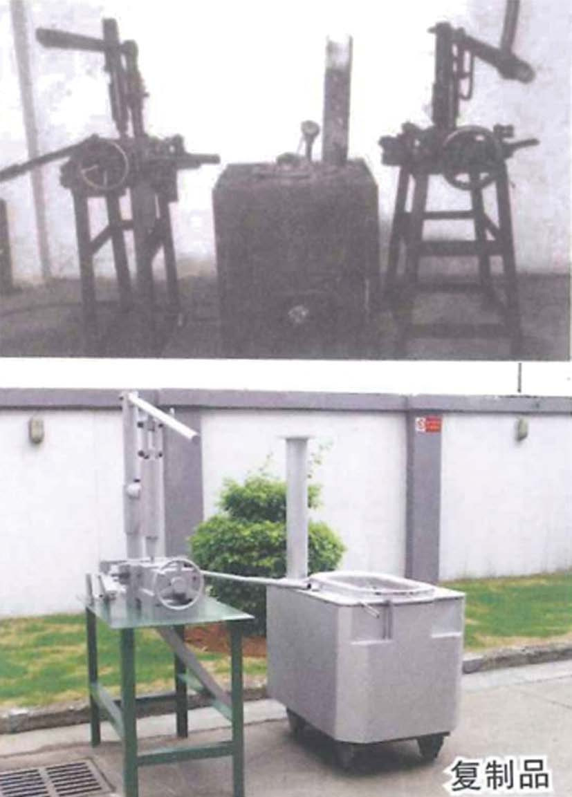 ▲ 圖1 地坑熔煉爐 (四)壓鑄產業的萌芽開花 1949年,廣州著名鎖廠中華泰記在香港創辦了華南鎖廠,此時廣州還有幾家鎖廠也到香港開廠,帶來了制鎖的機器和技術。這些以“前店后廠”形式經營的新工廠及香港本地一些金屬制品廠,為了批量生產出質量更好的鎖具,均開始了鎖具件的壓鑄技術研究。使用的首臺土法手動壓鑄機,俗稱“馬騮機”(見圖2),是以人體質量按下機器上方的手柄,打壓合金熔液,將之壓進工模內腔成型,壓鑄出零件。