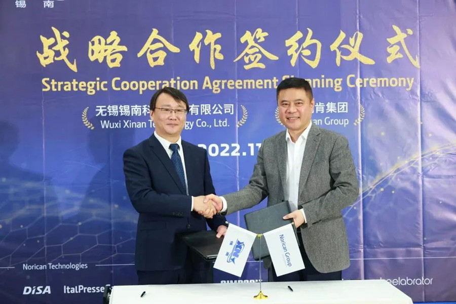 簽約儀式圓滿成功,出席嘉賓合影留念 近日,無(wú)錫錫南科技股份有限公司與諾瑞肯集團(tuán)達(dá)成重要戰(zhàn)略合作,于11月24日在諾瑞肯漢江工廠舉行了隆重的戰(zhàn)略合作簽約儀式,使雙方的合作邁向了一個(gè)新的里程碑。 根據(jù)合作協(xié)議,諾瑞肯將利用自身優(yōu)勢(shì)和資源,為錫南提供先進(jìn)的技術(shù)和產(chǎn)品,如一體化壓鑄單元(具體壓鑄機(jī)噸位和數(shù)量因涉及商業(yè)機(jī)密暫不披露),熔煉爐,定量爐,拋丸機(jī),除塵設(shè)備,數(shù)字化產(chǎn)品等。除了保持緊密的生產(chǎn)和技術(shù)交流,雙方也將在數(shù)字化轉(zhuǎn)型、SBTi科學(xué)碳目標(biāo)設(shè)定及可持續(xù)發(fā)展等方面展開實(shí)質(zhì)性深度合作,諾瑞肯將以自身在數(shù)字化領(lǐng)域的豐富實(shí)踐經(jīng)驗(yàn),充分協(xié)助錫南推進(jìn)減碳行動(dòng),提升綠色競(jìng)爭(zhēng)力,共同推進(jìn)鑄造行業(yè)的數(shù)字化轉(zhuǎn)型和可持續(xù)發(fā)展。 中國(guó)鑄造協(xié)會(huì)執(zhí)行副會(huì)長(zhǎng)高巍、諾瑞肯集團(tuán)亞太區(qū)高級(jí)副總裁魏寶華、諾瑞肯集團(tuán)鋁合金業(yè)務(wù)總裁Peter Holm Larsen、諾瑞肯集團(tuán)鋁合金業(yè)務(wù)高級(jí)副總裁Marco Gandini,以及無(wú)錫錫南科技股份有限公司總經(jīng)理李忠良、副總經(jīng)理顧登峰等代表出席了本次的簽約儀式。 無(wú)錫錫南科技股份有限公司專業(yè)從事鋁合金輕量化汽車零部件的研發(fā)與生產(chǎn),其主要產(chǎn)品為增壓器殼體,客戶涵蓋全球知名零部件制造商。隨著新能源汽車市場(chǎng)的快速發(fā)展,錫南近年來(lái)進(jìn)一步加大投資,專注于新能源汽車驅(qū)動(dòng)系統(tǒng),傳動(dòng)系統(tǒng)精密鋁合金殼體類零件研發(fā)與生產(chǎn)。由于生產(chǎn)過(guò)程對(duì)技術(shù)水平的要求極為嚴(yán)格,且在工藝方面對(duì)質(zhì)量和設(shè)備穩(wěn)定性的要求較高,錫南愈發(fā)堅(jiān)定了與諾瑞肯加強(qiáng)合作的決心。