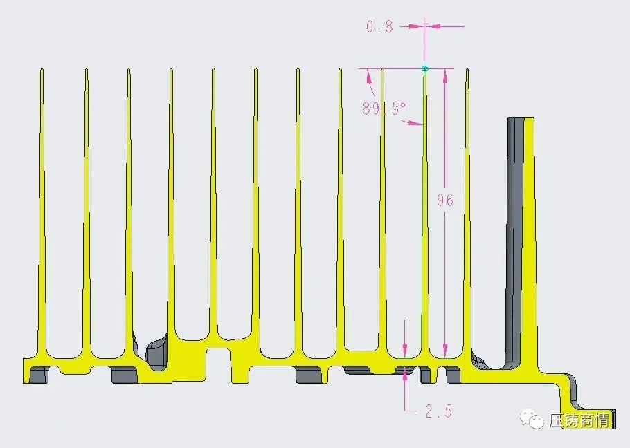 半固態流變壓鑄成形技術取得重大突破。近日,珠海市潤星泰電器有限公司(簡稱“珠海潤星泰公司”)借助于其在半固態流變成形上長期專心研究成果及獨特的技術,在拔模斜度0.5°、高度96mm、無頂出凸臺的條件下,實現了0.8mm的業界最薄散熱齒。