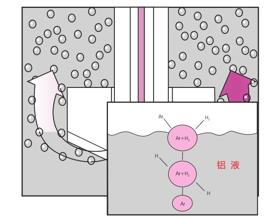 Calgas ® 的轉子能有效將惰性氣體打散成細小氣泡,均勻地在鋁液中散開、浮升。鋁液中的氫分壓比氣泡中高,氫會向惰性氣體擴散,并隨氣泡上浮至液面,從而有效地降低鋁液中的氫含量。