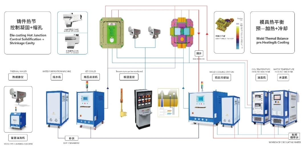 王潛龍先生表示, 超大型汽車壓鑄結構件生產過程中,金屬液在模具中的流程長,而且產品薄壁,對模具溫度變化與平衡提出更高的要求,模具溫度快速穩定成為壓鑄生產的必要條件。由于模具面積大,模面形狀復雜,需要使用多臺高分辨率的紅外相機在不同的視角監測,才能完整覆蓋整個模具,探譜特科技根據大型汽車壓鑄結構件一體化成型的溫控需求而開發出TPT-2000~TPT-8000系列等,并首創了“4+2”、“4+3”、“4+4”的監控模式,可滿足5000噸—20000噸壓鑄機的模溫監測需求。