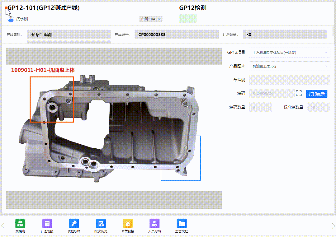 GP12產線終端界面(適用單件產品) 當檢測合格數量達到產品標準箱數量時,會自動觸發箱碼打印,同時支持二次檢驗、不滿箱打印,產品換箱等多種使用場景,基本覆蓋了客戶對GP12系統流程的所有要求。【適用范圍:單件管理的產品】