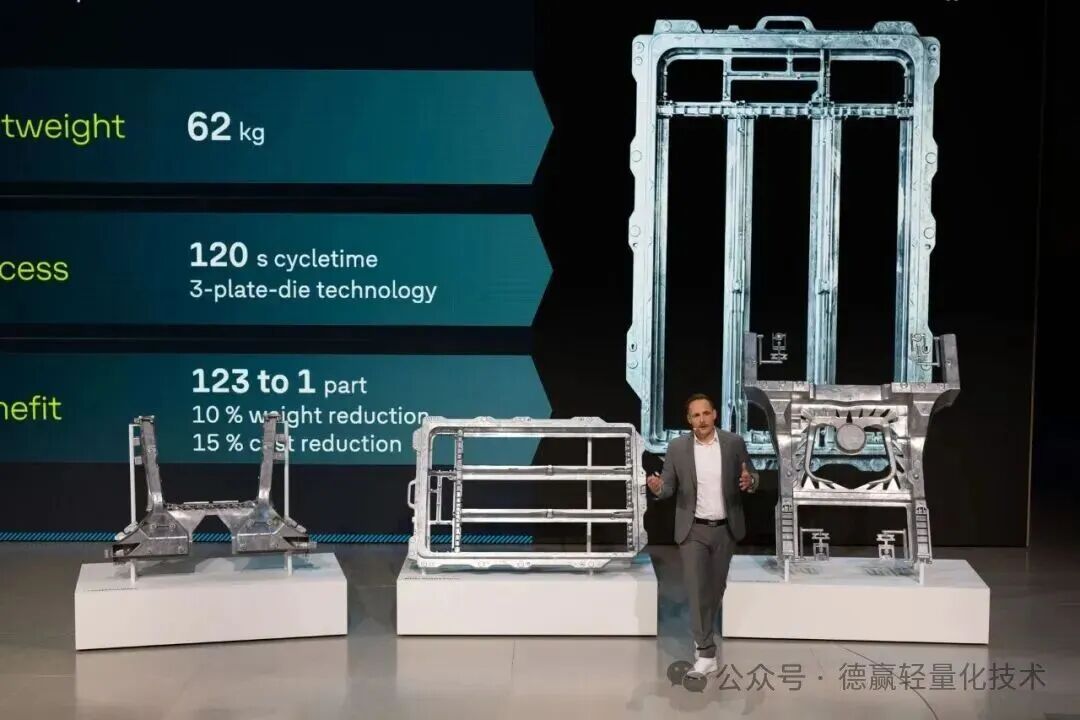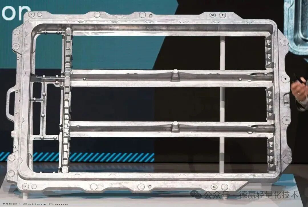 電池框架 此次展示的電池框架將成為大眾汽車旗下車型中首個應用一體化壓鑄技術的部件。其應用車型包括電動城市車系、ID. Polo、ID. Cross概念車、Cupra Raval以及斯柯達Epiq。 作為該德國集團迄今最復雜的鑄件,其長1.7米、寬1.15米,替代了123個獨立部件,助力整車減重10%至62公斤。 技術細節顯示其生產周期(節拍)時間為120秒,采用三板模具技術,成本降低達15%。 該電池框架方案極具創新性,與以往我們見過的其他一體化壓鑄電池托盤存在顯著差異。