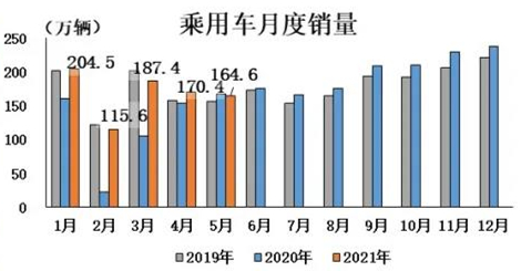 乘用車產銷同比小幅下降。 5月,乘用車產銷分別完成161.7萬輛和164.6萬輛,環比分別下降5.7%和3.4%;同比分別下降2.7%和1.7%,與上月相比,增速由正轉負。1-5月,乘用車產銷分別完成828.5萬輛和843.7萬輛,同比分別增長39.1%和38.1%。
