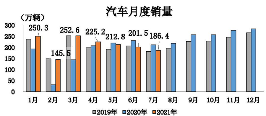 乘用車產銷降幅有所收窄 7月,乘用車產銷分別完成154.8萬輛和155.1萬輛,環比分別下降0.5%和1.1%,同比分別下降10.7%和7%,降幅比6月分別收窄3和4.1個百分點。1-7月,乘用車產銷分別完成1139.4萬輛和1156萬輛,同比分別增長20.1%和21.2%。