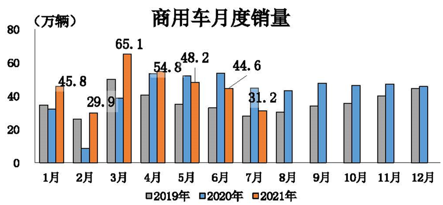 商用車產銷同比大幅下降 7月,商用車產銷分別完成31.5萬輛和31.2萬輛,環比分別下降18.8%和30%,同比分別下降33.2%和30.2%。1-7月,商用車產銷分別完成304.5萬輛和319.6萬輛,同比分別增長7.6%和12.9%。