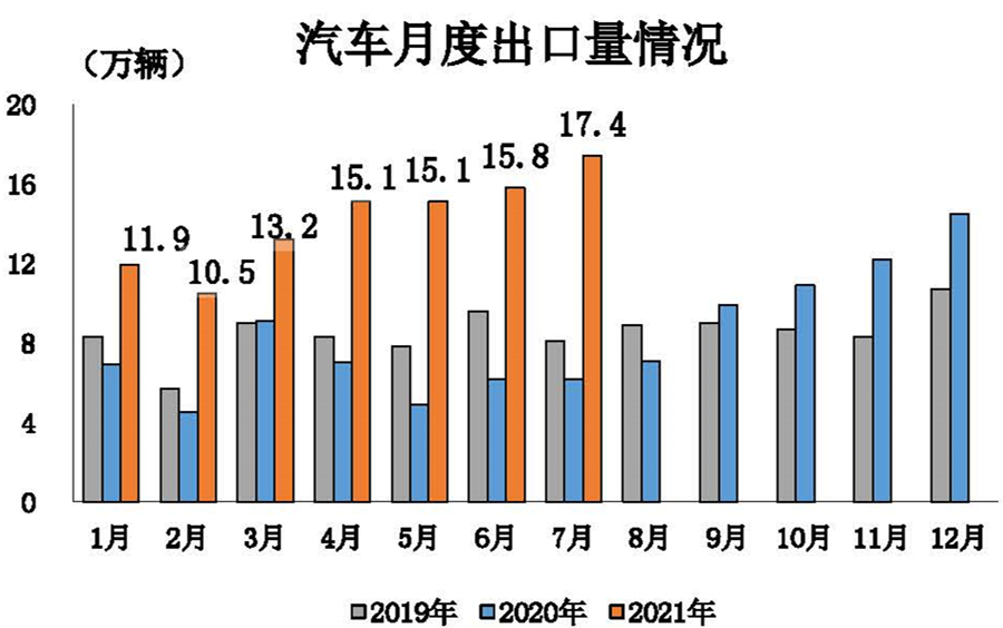 汽車出口再創新高 7月,汽車企業出口17.4萬輛,環比增長9.8%,同比增長1.8倍,本月出口再創歷史新高。1-7月,汽車企業出口100.2萬輛,同比增長1.2倍。
