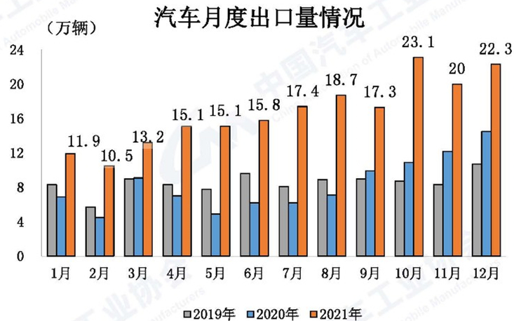 汽車出口創(chuàng)歷史新高 2021年12月,汽車企業(yè)出口22.3萬(wàn)輛,環(huán)比增長(zhǎng)11.4%,同比增長(zhǎng)54%;2021年全年,汽車出口201.5萬(wàn)輛,同比增長(zhǎng)1倍,占汽車銷售總量的比重為7.7%。