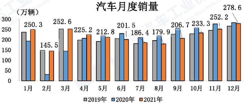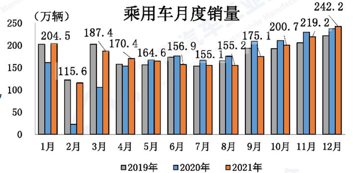 乘用車市場(chǎng)繼續(xù)保持2000萬(wàn)輛以上規(guī)模 2021年12月,隨著芯片供應(yīng)問題較11月有所緩解,疊加企業(yè)年底沖量因素,本月乘用車產(chǎn)銷分別完成252.7萬(wàn)輛和242.2萬(wàn)輛,同比分別增長(zhǎng)8.4%和2%;2021年全年,乘用車產(chǎn)銷分別完成2140.8萬(wàn)輛和2148.2萬(wàn)輛,同比分別增長(zhǎng)7.1%和6.5%。