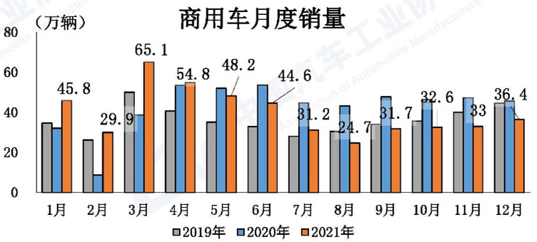商用車產(chǎn)銷有所下降 2021年12月,商用車產(chǎn)銷分別完成38萬(wàn)輛和36.4萬(wàn)輛,環(huán)比分別增長(zhǎng)7.7%和10.5%,同比分別下降25.3%和20.1%;2021年全年,商用車產(chǎn)銷分別完成467.4萬(wàn)輛和479.3萬(wàn)輛,同比下降10.7%和6.6%。