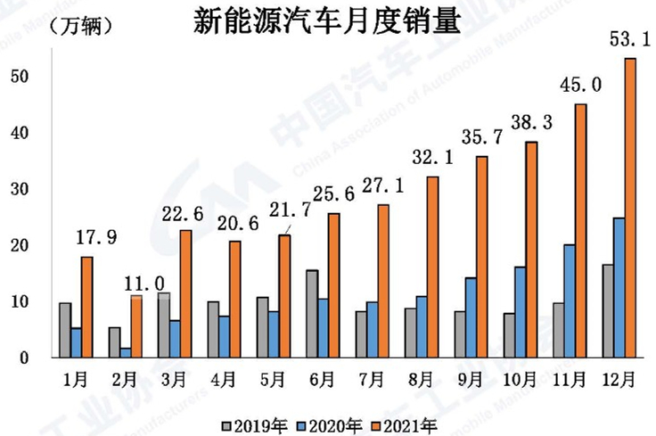 新能源汽車產(chǎn)銷超過350萬(wàn)輛 2021年12月,新能源汽車產(chǎn)銷分別完成51.8萬(wàn)輛和53.1萬(wàn)輛,同比分別增長(zhǎng)1.2倍和1.1倍,再創(chuàng)歷史新高,12月新能源汽車產(chǎn)滲透率達(dá)到19.1%。2021年全年,新能源汽車產(chǎn)銷分別達(dá)到354.5萬(wàn)輛和352.1萬(wàn)輛,同比增長(zhǎng)均為1.6倍,市場(chǎng)占有率提升至13.4%。 新能源汽車成為汽車行業(yè)最大亮點(diǎn),其市場(chǎng)發(fā)展已經(jīng)從政策驅(qū)動(dòng)轉(zhuǎn)向市場(chǎng)拉動(dòng)新發(fā)展階段,呈現(xiàn)出市場(chǎng)規(guī)模、發(fā)展質(zhì)量雙提升的良好發(fā)展局面。