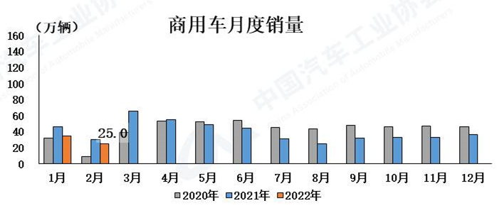 商用車同比降幅有所收窄 2月,商用車產(chǎn)銷分別完成27.9萬(wàn)輛和25萬(wàn)輛,環(huán)比分別下降19.2%和27.4%,同比分別下降18.3%和16.6%。1-2月,商用車產(chǎn)銷分別完成62.4萬(wàn)輛和59.4萬(wàn)輛,同比分別下降24%和21.7%。
