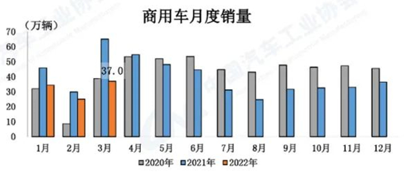商用車產銷同比明顯下降 3月,商用車產銷分別完成36萬輛和37萬輛,環比分別增長29.2%和47.7%,同比分別下降38%和43.5%。1-3月,商用車產銷分別完成98.5萬輛和96.5萬輛,同比分別下降29.7%和31.7%。