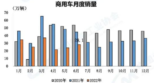商用車表現(xiàn)依然低迷 6月,商用車產(chǎn)銷分別為26.1萬輛和28.1萬輛,環(huán)比分別增長15.7%和17.4%,同比分別下降33.2%和37.4%。1-6月,商用車產(chǎn)銷分別完成168.3萬輛和170.2萬輛,同比分別下降38.5%和41.2%。