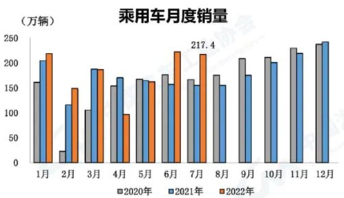 乘用車產銷基本保持上月水平 7月,乘用車產銷分別完成221萬輛和217.4萬輛,環比分別下降1.3%和2.1%,同比分別增長42.6%和40%。1-7月,乘用車產銷分別完成1264.5萬輛和1252.9萬輛,同比分別增長10.9%和8.3%。