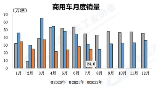 商用車降幅收窄 7月,商用車產銷分別完成24.4萬輛和24.6萬輛,環比分別下降6.2%和12.5%,同比分別下降22.9%和21.5%。1-7月,商用車產銷分別完成192.7%萬輛和194.8萬輛,同比分別下降36.9%和39.3%。