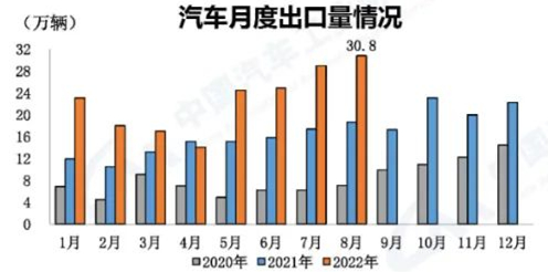 汽車出口再創歷史新高 8月,汽車企業出口達30.8萬輛,連續創歷史新高,實現首次單月出口超30萬輛,環比增長6.2%,同比增長65%。其中,新能源車出口8.3萬輛,環比增長53.6%,同比增長82.3%,呈高速增長勢頭。1-8月,汽車企業出口181.7萬輛,同比增長52.8%。其中,新能源汽車出口34萬輛,同比增長97.4%。