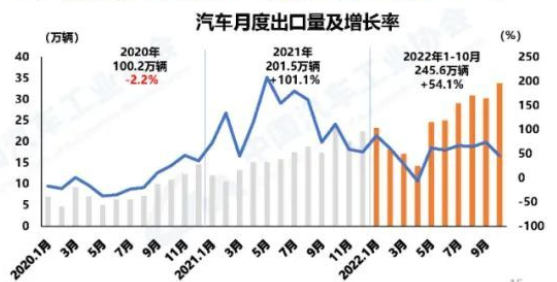 汽車出口創(chuàng)新高 10月,汽車企業(yè)出口創(chuàng)歷史新高,達(dá)到33.7萬輛,環(huán)比增長12.3%,同比增長46%。1-10月,汽車企業(yè)出口245.6萬輛,同比增長54.1%。分車型看,乘用車出口197.5萬輛,同比增長57.1%;商用車出口48萬輛,同比增長43%;新能源汽車出口49.9萬輛,同比增長96.7%。
