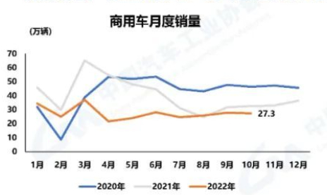 商用車市場仍處于低位徘徊態(tài)勢 10月,商用車產(chǎn)銷分別完成26.5萬輛和27.3萬輛,產(chǎn)量環(huán)比增長0.8%,銷量環(huán)比下降1.8%;同比分別下降22.7%和16.2%。1-10月,商用車產(chǎn)銷分別完成269.1萬輛和275.7萬輛,同比分別下降31.7%和32.8%。