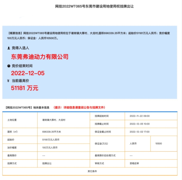 ![]() 昨日(12月5日),比亞迪全資子公司——東莞弗迪動(dòng)力有限公司以總價(jià)51181萬(wàn)元競(jìng)得位于東莞市謝崗鎮(zhèn)大厚村、大龍村一宗建設(shè)工業(yè)用地,宗地面積為696339.35平方米。該出讓地塊將用于汽車零部件及配件制造產(chǎn)業(yè)。值得注意的是,此次謝崗引進(jìn)比亞迪項(xiàng)目,是東莞首個(gè)汽車產(chǎn)業(yè)鏈的全局引入。項(xiàng)目將在2024年1月4日前開(kāi)工,2025年1月4日前竣工。