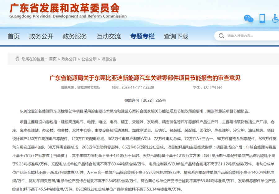 據(jù)了解,今年11月17日,廣東省發(fā)展和改革委員會(huì)發(fā)布消息,東莞比亞迪新能源汽車關(guān)鍵零部件項(xiàng)目節(jié)能報(bào)告通過(guò)了廣東省能源局的審查。公告顯示,該項(xiàng)目由東莞弗迪動(dòng)力有限公司實(shí)施建設(shè),建設(shè)地位于東莞市謝崗大厚村,總投資額高達(dá)65億元,總建筑面積約95萬(wàn)平方米。項(xiàng)目主要建設(shè)高壓電氣、電源、電控、電機(jī)、精工、變速器、發(fā)動(dòng)機(jī)、精密裝備等汽車零部件產(chǎn)品生產(chǎn)線,主要建筑包括生產(chǎn)廠房、倉(cāng)庫(kù)、廢水處理站、辦公樓、宿舍樓、文體中心等。