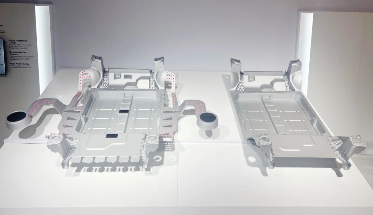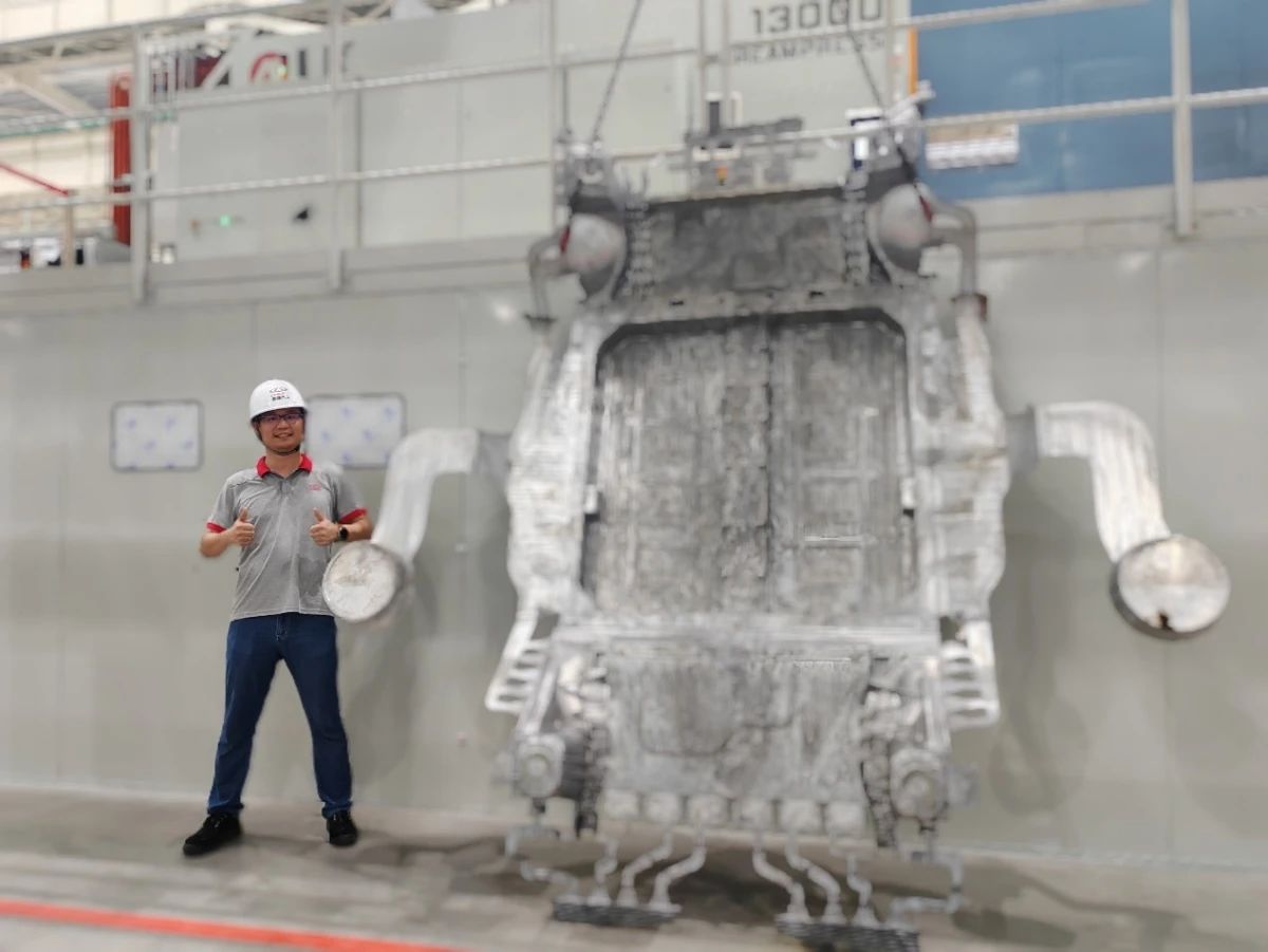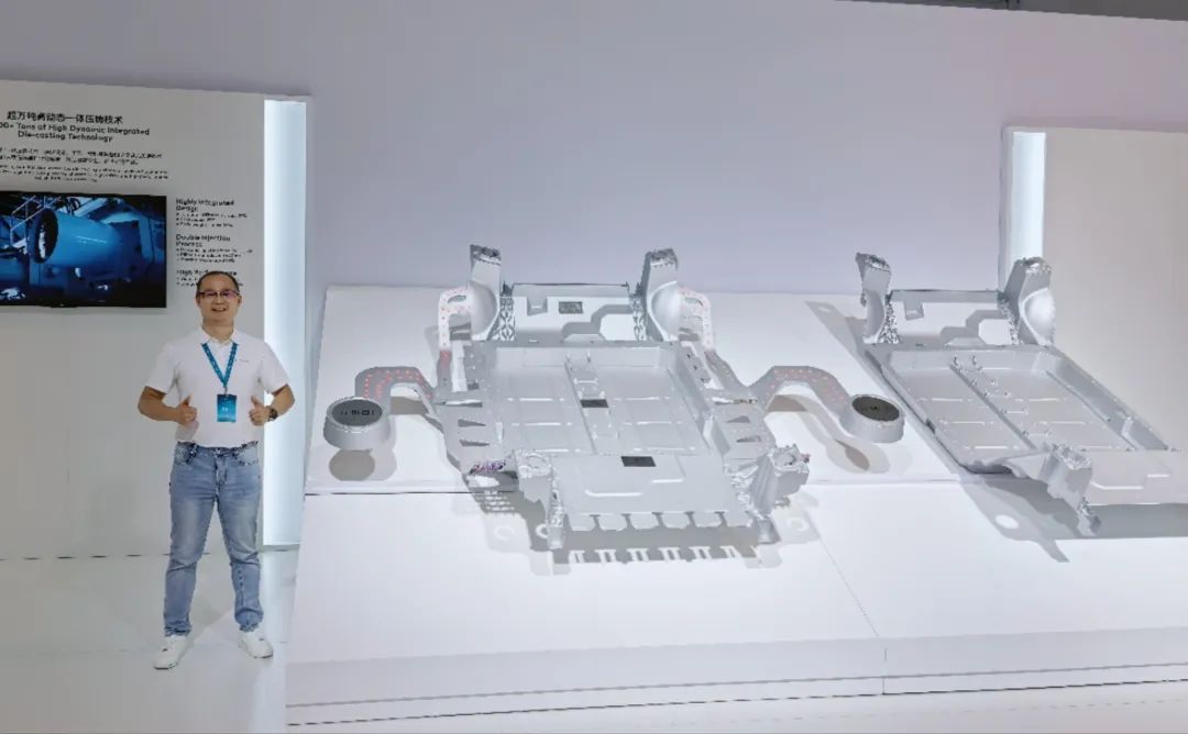 肖榕總工在超大型壓鑄件旁留影 安全守護,高性能保障 在高性能保障方面,奇瑞汽車采用了高強度、高流動性的新材料,使屈服強度和抗拉強度分別提升至≥150MPa和≥300MPa,分別比目前行業的高出24%和22%。此外,高動態壓射系統還進一步提升了材料的延伸率,達到44%的顯著提升。 降本增效,高集成設計 該技術還實現了高集成設計。通過優化零件結構,奇瑞汽車將原本需要150多個零件組成的部件集成為一個整體。這一設計不僅大幅提升了零件的扭轉剛度,還顯著降低了成本,實現了22%的成本下降。同時,車身重量也減輕了20%,精度提高了15%,為汽車的輕量化、高效化提供了有力支持。
