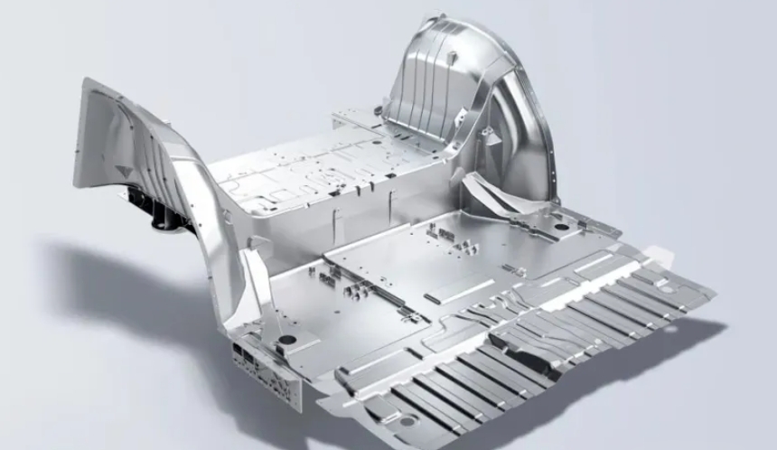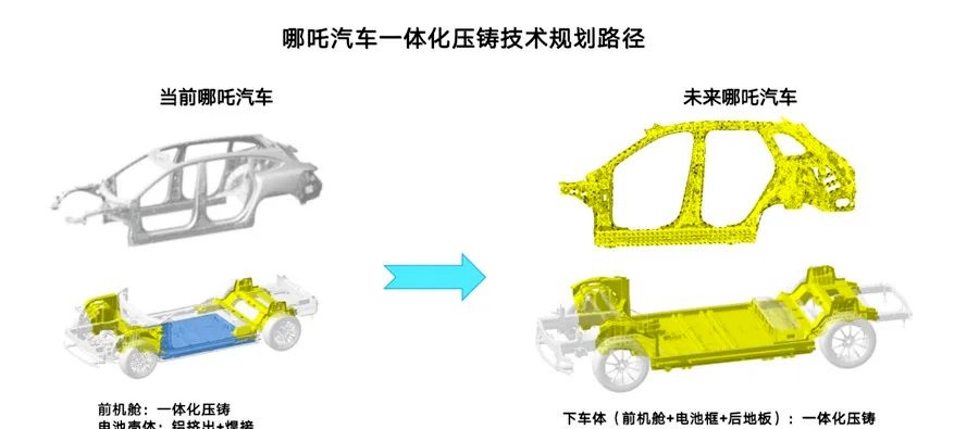 哪吒在2023年8月21號發布了浩智戰略,其中的滑板底盤很重要的一個技術就是一體化壓鑄,采用的也是前機艙一體化+后車地板一體化的方案。