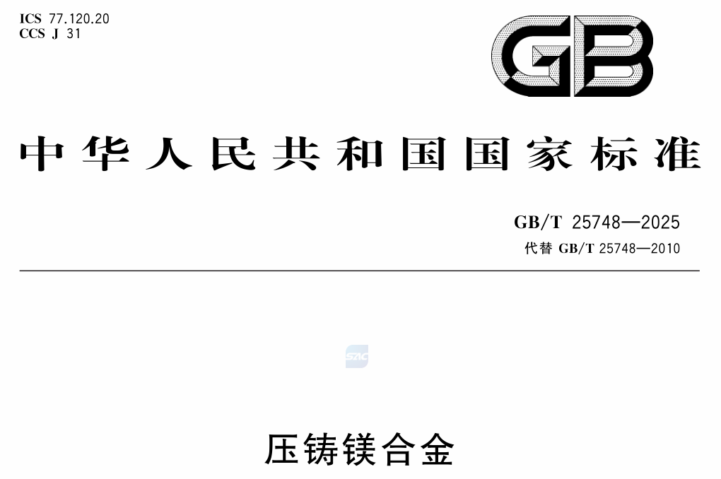 2025年12月2日,國(guó)家市場(chǎng)監(jiān)督管理總局、國(guó)家標(biāo)準(zhǔn)化管理委員會(huì)聯(lián)合發(fā)布了 GB/T 25748-2025《壓鑄鎂合金》國(guó)家標(biāo)準(zhǔn)。