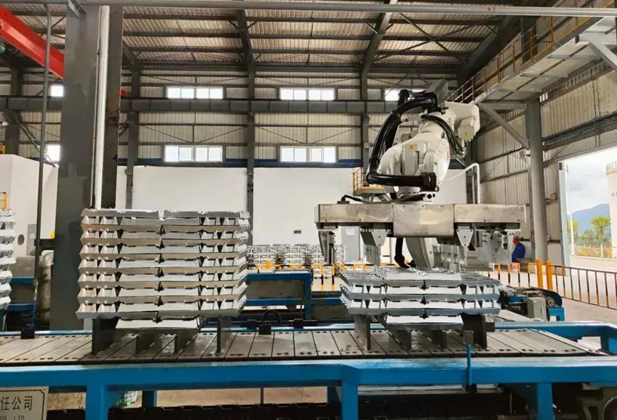 據介紹,項目主體設備選用“有芯感應爐+可傾有芯感應爐+電阻保溫爐”,配套液壓升降式加料裝置,合金爐自帶稱重保障精準配料,探針聯鎖穩定控制出液流量,機器人高效自動扒皮,風冷搭配均水噴淋,激光打碼自動碼垛、打包、稱重、貼簽,全流程自動化高,控制精準,操作規范,精選99.996%以上鋅片搭配99.85%重熔鋁錠和99.95B鎂錠作為合金錠生產原料,與現有工藝實現閉環,形成了一套完整的環保、低耗、資源綜合利用的冶煉產業鏈體系。