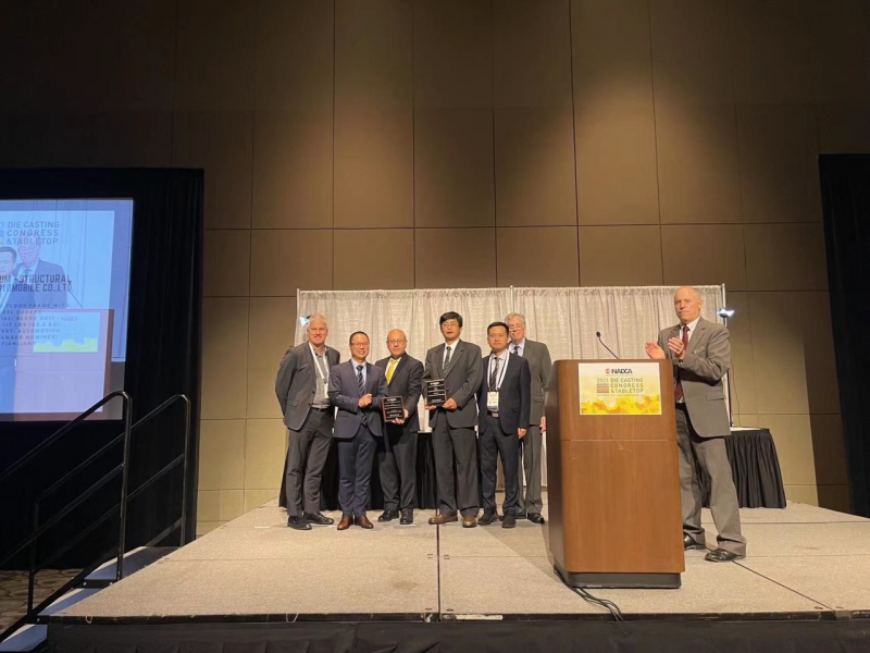 帥翼馳董事長程帥(左2)在頒獎現場 此次盛會頒發了北美壓鑄協會諸多年度大獎,其中,最值得關注的是最佳結構件評比大獎(Aluminum Structural),堪比壓鑄界的奧斯卡。經過激烈的競爭和評比,繼去年之后,本次最佳結構件評比大獎再一次頒給了國內車企的大型一體化壓鑄部件。由賽力斯汽車主導設計、文燦集團制造、帥翼馳新材料集團 /美鋁供應材料,三方聯合申報的“集成輪罩后地板總成(Rear Floor with Wheel Covers)方案”摘得桂冠。該方案的鑄件重53.2公斤,實現了市面上一體化壓鑄部件中最高的集成度(87件集成為1件),應用了最大噸位壓鑄機(力勁9000噸);同時,該鑄件實現了平均壁厚3.02mm,以及28%的輕量化效果,為車身開發周期縮短為6個月提供了有力的支撐。