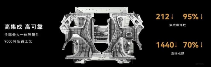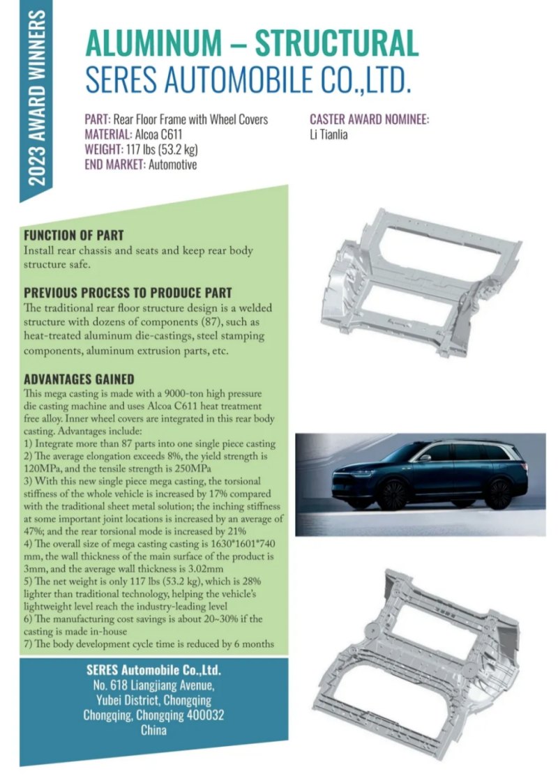 據悉,該鑄件被應用于大型SUV產品AITO問界M9,其由全新D級豪華SUV平臺打造,采用全鋁合金底盤。該車型最大亮點之一即為搭載大型一體壓鑄后車體等壓鑄件,該車型將其中的222個零部件,集成為10個一體化壓鑄零部件,零部件數量下降95%;連接點數量減少1440個,下降70%,帶來更高的集成度,更高的可靠(剛度)性,更加的輕量化。本鑄件從零件設計、模具開發、材料驗證均由國內壓鑄一體化領域專業團隊合力研發,該鑄件的獲獎也再次體現了我國的免熱處理鋁合金材料和鋁合金一體化大型壓鑄行業已呈現出高質量快速發展態勢,在一體化大型壓鑄鋁合金材料技術上已處于世界先進水平。