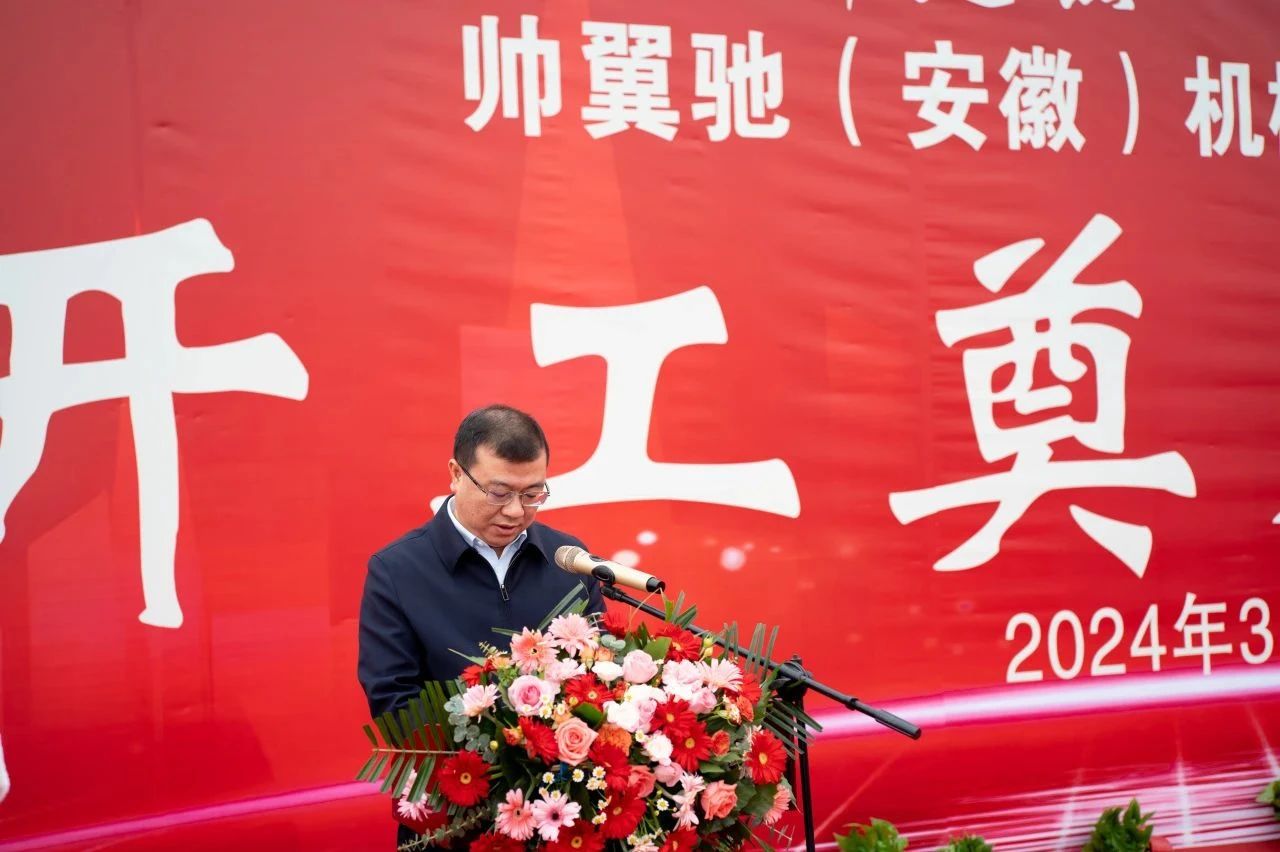 安徽省含山縣委書記錢俊,含山縣委副書記、縣長劉志遠,含山縣委常委、常務副縣長裴小勇,含山副縣長、含山經濟開發區黨工委書記、管委會主任汪曉沛,昆山萊捷有色金屬有限公司總經理王勇杰,帥翼馳新材料集團董事長、總裁程帥,董事、常務副總裁譚喜元,董事、副總裁徐闖,帥翼馳(安徽)機械設備有限公司總經理王楚均等領導出席了開工奠基儀式,并為項目奠基揮鏟培土。出席的嘉賓還有含山縣各委辦局領導、客戶及施工方代表等。