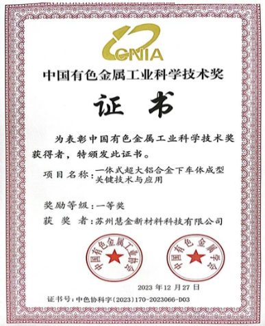 ![]() 革新材料 為汽車工業保駕護航 低碳使命 用綠色環保鑄就未來 中國新能源智能汽車產業強勢崛起,隨之而來的是供應鏈技術的全面升級。輕量化新材料的應用是其中的熱門話題,鋁合金則是現在應用最廣泛的輕量化材料。中國車市越來越卷,各個廠家“卷技術、卷質量、卷成本”,對于鋁合金技術的要求也越來越高。主要的要求集中在降本、性能和低碳環保這三個層面。 蘇州慧金新材料科技有限公司(簡稱:慧金科技)堅持“以市場需求為研發動力”,通過與上海交通大學曾小勤教授團隊的深度合作,開發出免熱處理高強高韌鋁合金新材料“纖晶”,這款全棧自研的鋁合金新材料已應用在豪華純電SUV極氪009的后車身上,并且在極氪001,極氪007后車身上也得到了量產應用。該項目已獲得中國有色金屬工業科學技術獎一等獎。“纖晶”的應用使得該零部件的生產過程徹底免除了傳統的熱處理強化工藝環節,顯著提升了全流程生產效率,成功減少焊接點近800個,在遇到沖擊時變形量可減少16%,彎曲剛度提升11%,有效保護車身后部安全。在這款產品的基礎上,慧金科技繼續深挖,通過市場反饋數據,不斷拓展研發思路。并在近期推出全新綠色免熱處理再生鋁產品 “臻晶”,這款產品在“提升再生鋁添加比例”和“確保高品質性能”之間做到極致平衡,并在能耗和排放方面突破行業極限。一經推出就受到多個汽車品牌的高度關注,目前正處在驗證階段,并即將實現大批量量產,這款材料已經獲得國內、美國及歐盟國際專利。