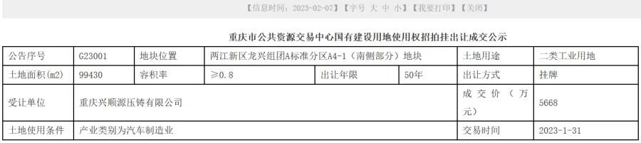 據了解,華域皮爾博格有色零部件(上海)有限公司是由華域汽車系統股份有限公司和德國KSPG公司雙方共同投資建立的有色零部件合資企業。該項目將與寶馬等名優品牌新能源汽車配套合作。 重慶渝江壓鑄購買近10萬平米工業用地 近日(2月7日),重慶市公共資源交易中心發布消息,重慶興順源壓鑄有限公司以5668萬元競得重慶市兩江新區龍興組團A標準分區A4-1(南側部分)地塊使用權,土地面積為99430平方米,該地塊使用產業類別為汽車制造業。