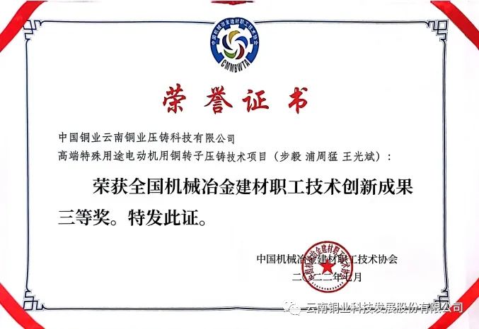 江蘇嶸泰股份副總經(jīng)理張偉中介紹,“今年以來,新能源訂單大幅增長,同比增加50%以上,目前公司一期產(chǎn)能已經(jīng)飽和,二期項目的快速推進,將解決我們產(chǎn)能不足的壓力,預(yù)計在二季度進行試生產(chǎn),下半年進入批量生產(chǎn),今年二期項目有望實現(xiàn)產(chǎn)值2個億。”該項目分兩期建設(shè),項目全部建成達產(chǎn)后,可形成年產(chǎn)新能源汽車鋁合金精密壓鑄件410萬件。 云銅科技“高端特殊用途電動機用銅轉(zhuǎn)子壓鑄技術(shù)項目”榮獲創(chuàng)新成果獎 來自云南銅業(yè)科技發(fā)展股份有限公司消息,近日,其“高端特殊用途電動機用銅轉(zhuǎn)子壓鑄技術(shù)項目”榮獲2022年度全國機械冶金建材行業(yè)創(chuàng)新成果三等獎。