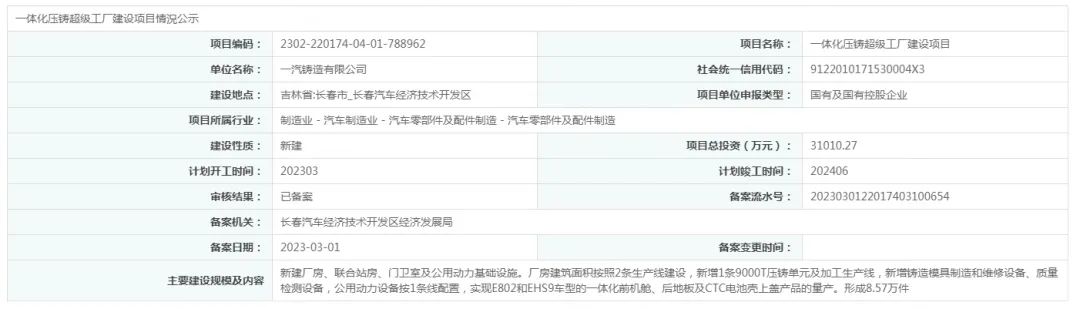 ![]() 一汽鑄造擬新建一體化壓鑄工廠 近日(3月1日),長春汽車經濟技術開發區經濟發展局發布一體化壓鑄超級工廠建設項目備案公示。該項目由一汽鑄造有限公司投資建設,主要建設內容為新建廠房、聯合站房、公用動力基礎設施等。