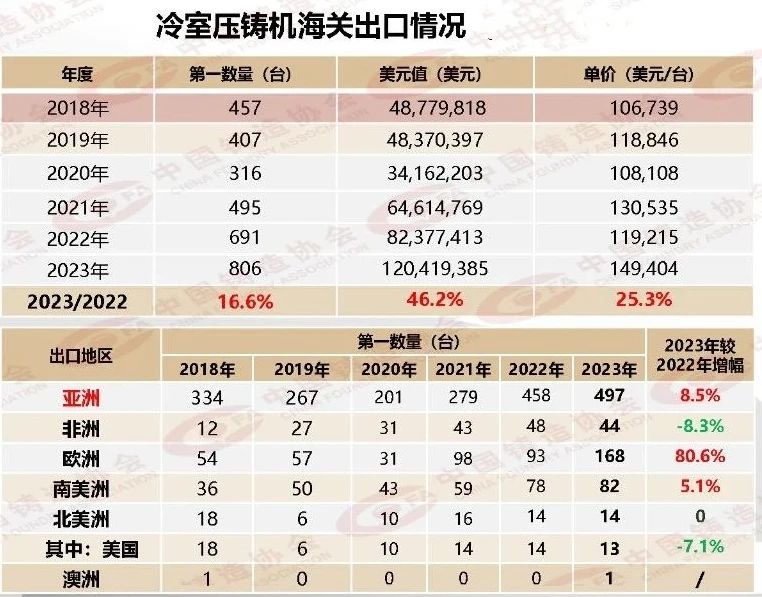 2023年,我國出口冷室壓鑄機806臺,較2022年增長16.6%;進口冷室壓鑄機143臺,同比下降15.4%。