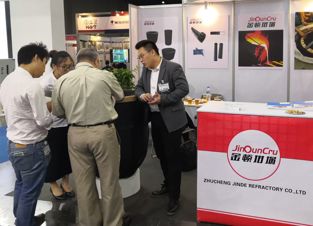 金頓坩堝參展團(tuán)隊(duì),左二為總經(jīng)理劉夕聰先生 2019年12月12日-14日, 2019亞洲及泛太平洋地區(qū)金屬工業(yè)展覽會(huì)(METAL AP),在泰國(guó)曼谷國(guó)際貿(mào)易和展覽中心舉行。諸城市錦德耐火材料有限公司(“金頓坩堝”)攜一款型號(hào)為1800的碳化硅石墨坩堝參展。與此同時(shí),金頓坩堝還推介其帶嘴坩堝、感應(yīng)爐直體坩堝以及石墨轉(zhuǎn)子、熱電偶保護(hù)管等石墨硅耐火材料產(chǎn)品,為東南亞客戶(hù)提供多樣化、全方位的熔煉材料解決方案。 東南亞作為現(xiàn)今快速發(fā)展的新興市場(chǎng),具有很大的市場(chǎng)潛力,為國(guó)內(nèi)廠(chǎng)家提供了拓展海外的機(jī)遇。金頓坩堝作為國(guó)內(nèi)坩堝品牌的代表之一,活躍于有色鑄造及壓鑄行業(yè),參與海外壓鑄展,積極拓展東南亞市場(chǎng),能更好的把產(chǎn)品推向市場(chǎng),服務(wù)更多的客戶(hù),為客戶(hù)創(chuàng)造價(jià)值。公司負(fù)責(zé)人表示,此次泰國(guó)展,讓公司更深入了解客戶(hù)的需求,當(dāng)?shù)厥袌?chǎng)發(fā)展情況,并為公司帶來(lái)新的合作意向,其對(duì)東南亞市場(chǎng)充滿(mǎn)信心。