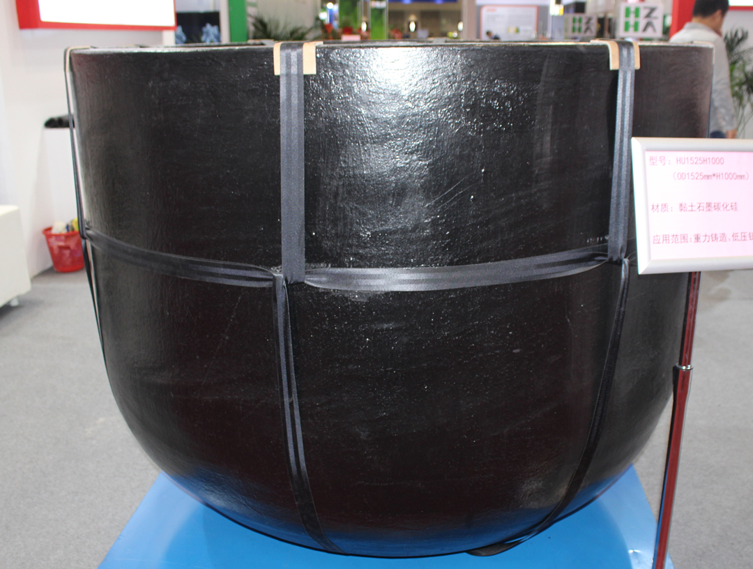 此次展出的HU1525H1000 黏土石墨碳化硅坩堝,高度1000mm,容量2.8噸。該款產(chǎn)品最高高度可做到1480mm,可熔煉4.5噸有色金屬。作為大容量坩堝,技術(shù)工藝要求更高,公司技術(shù)團(tuán)隊(duì)經(jīng)過多年的技術(shù)攻關(guān),研發(fā)出了該款產(chǎn)品,主要應(yīng)用于汽車上的關(guān)鍵零部件生產(chǎn),使用壽命長,可滿足生產(chǎn)該系列部件所需要的極高純度的鋁液的要求。