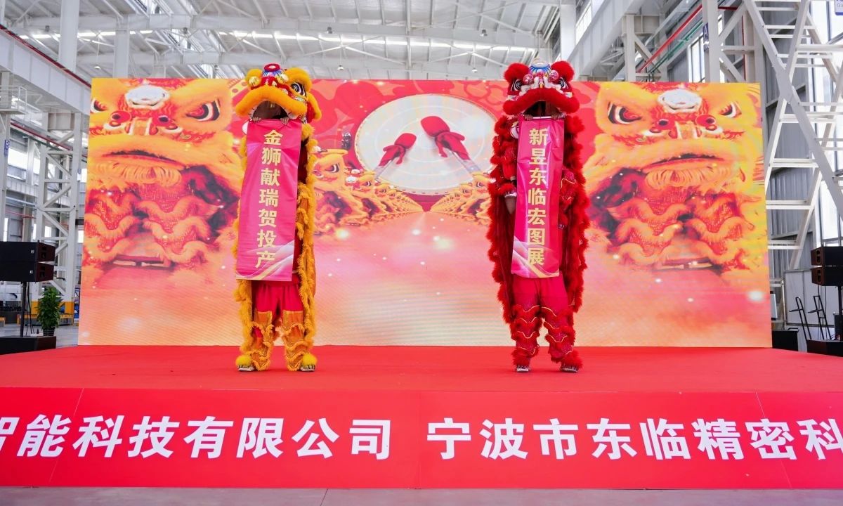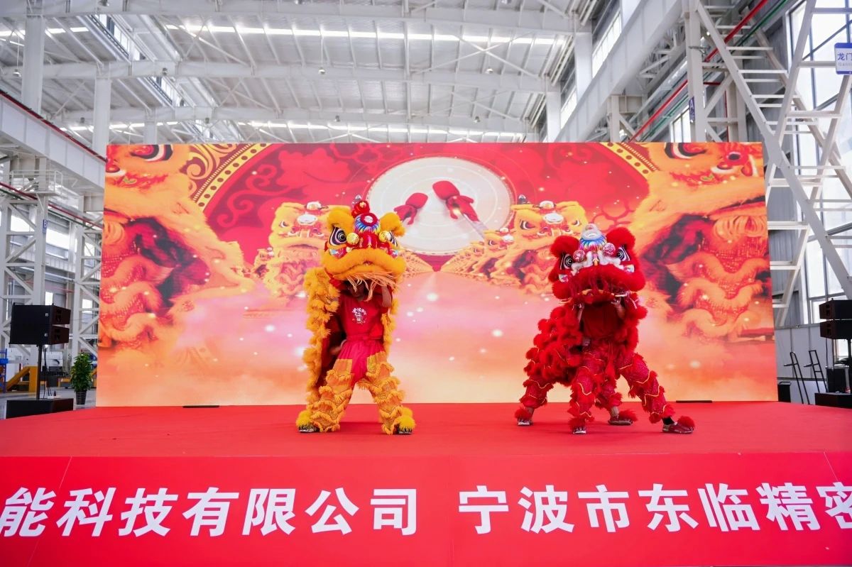 最后,現場舉行了精彩紛呈的舞獅表演和采青儀式。新昱科技總經理王蘇華與公司股東趙立沖先生共同上臺為醒獅點睛,這一傳統儀式寓意著企業興旺發達、蒸蒸日上。隨后,銷售總監劉傳臺先生采摘青菜,寓意著財富落地生根。禮畢,醒獅口吐對聯:“金獅獻瑞賀投產,新昱東臨宏圖展!”將現場氣氛推向高潮,表達了對新昱科技和東臨精密未來發展的美好祝愿。